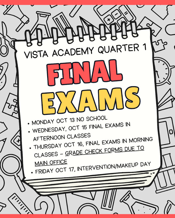 Quarter 1 finals are Wednesday (10/15) and Thursday (10/16) with Friday (10/17) being an intervention/Finals Make-up Day!